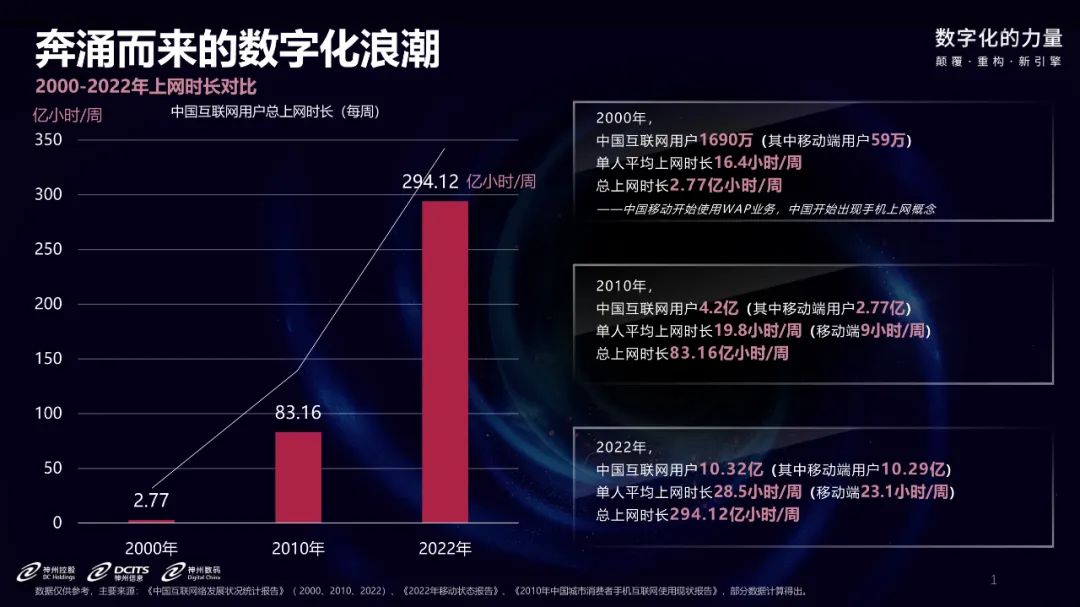 从消费的角度来看,2000年的时候,全中国上网的人数是1000多万,周上网时间18小时;今天上网人数超过10亿人,周上网时间超过28小时,每一天有四个小时左右的时间是在网上。如今的网上消费和二十年前有着本质差别,当时以时间为单位,今天以流量为单位,消费过程中的数据消费已经成为非常重要的内容。