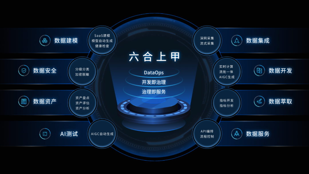 “六合上甲”是基于DataOps和DataFabric理念,融入AIGC自动生成技术的一站式的智能大数据全生命周期研发平台,用户只需一个平台即可完成数据的采集、开发、治理、分析、分享等全链路数智场景,实现将企业数据向数据资产的转化,帮助企业激活数据价值。
