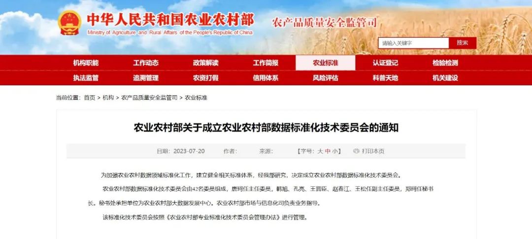 为了加强农业农村领域数据标准化工作,建立健全相关标准体系,农业农村部数据标准化技术委员会(以下简称农业数据标委会)于近日正式成立,神州信息副总裁王宇飞入选农业数据标委会委员。
